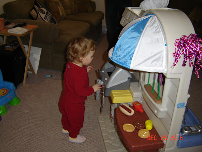 Well I can't believe that Christmas is over already. What a great day! Hannah had a blast... she loved opening her gifts and those of everyone else... she did eventually understand that not everything was for her. Favorites at the time I would say ... books from Grandma Jeanne & Grandpa Bob, Dora socks & panties from Grandpa Nou & Grandma Anita and she really loved her new kitchen (from Nan & Pop) good thing it was the last thing she received.